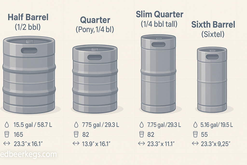 A U.S. beer barrel equals 31 gallons. A half barrel is 15.5 gallons. A quarter barrel holds 7.75 gallons. A sixth barrel or sixtel carries 5.16 gallons. People also say “pony keg” for the short, wide quarter, and “slim quarter” for the tall, narrow version with the same volume.